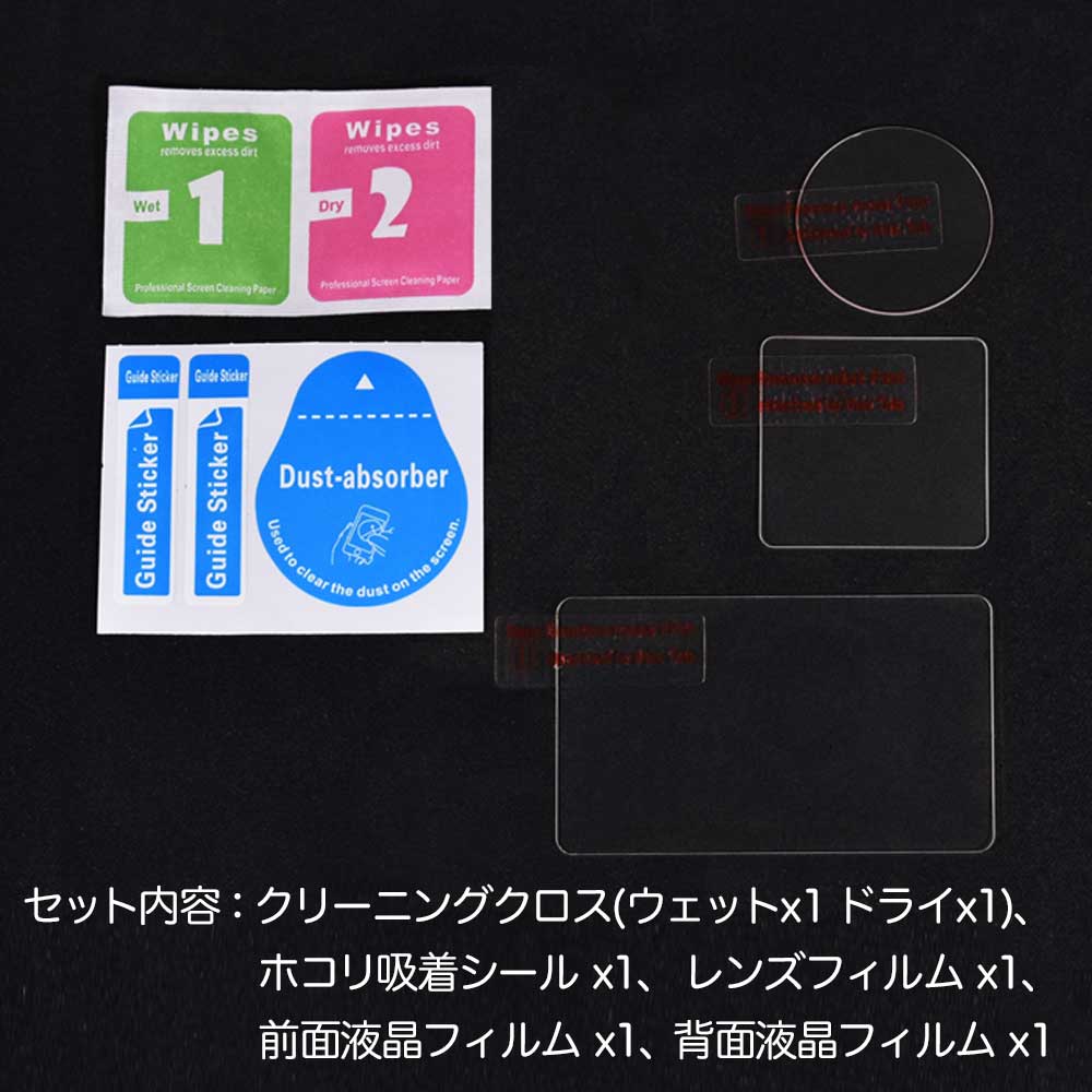 【セット内容】液晶フィルム背面用x1、液晶フィルム前面用x1、レンズフィルムx1、クリーニングクロス(ウェット/ドライ) x各1、ホコリ吸着シール x1